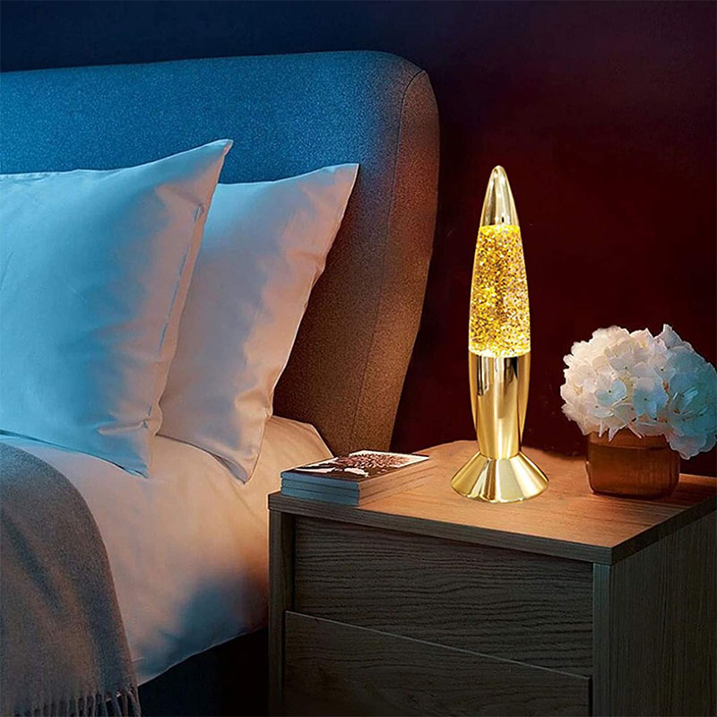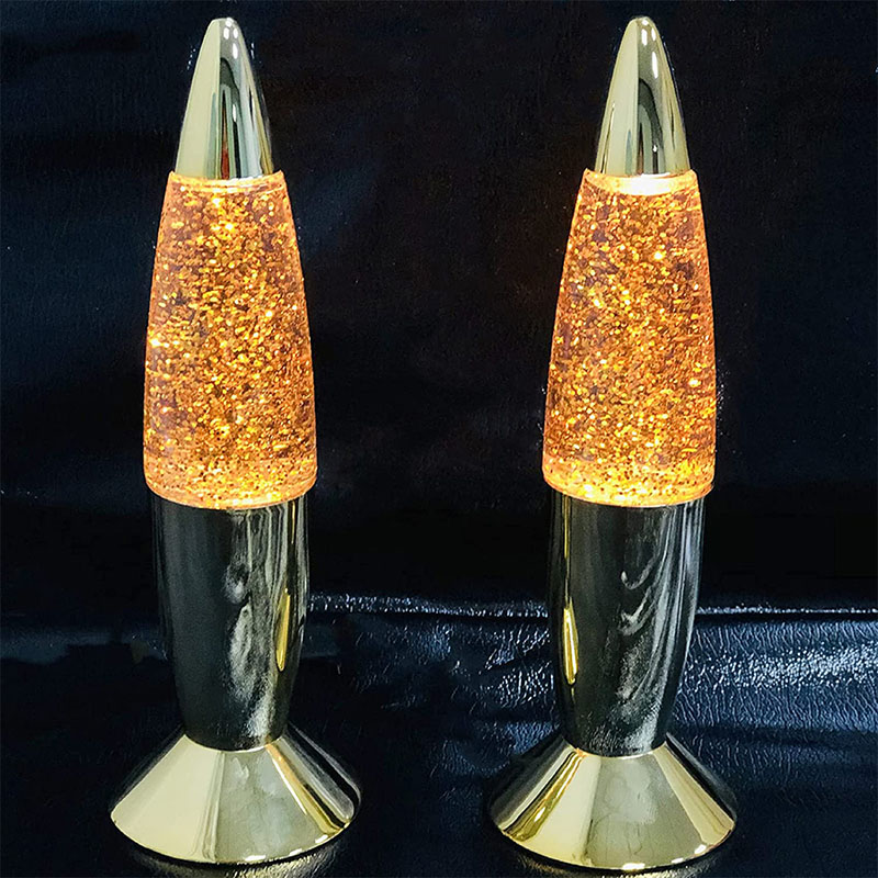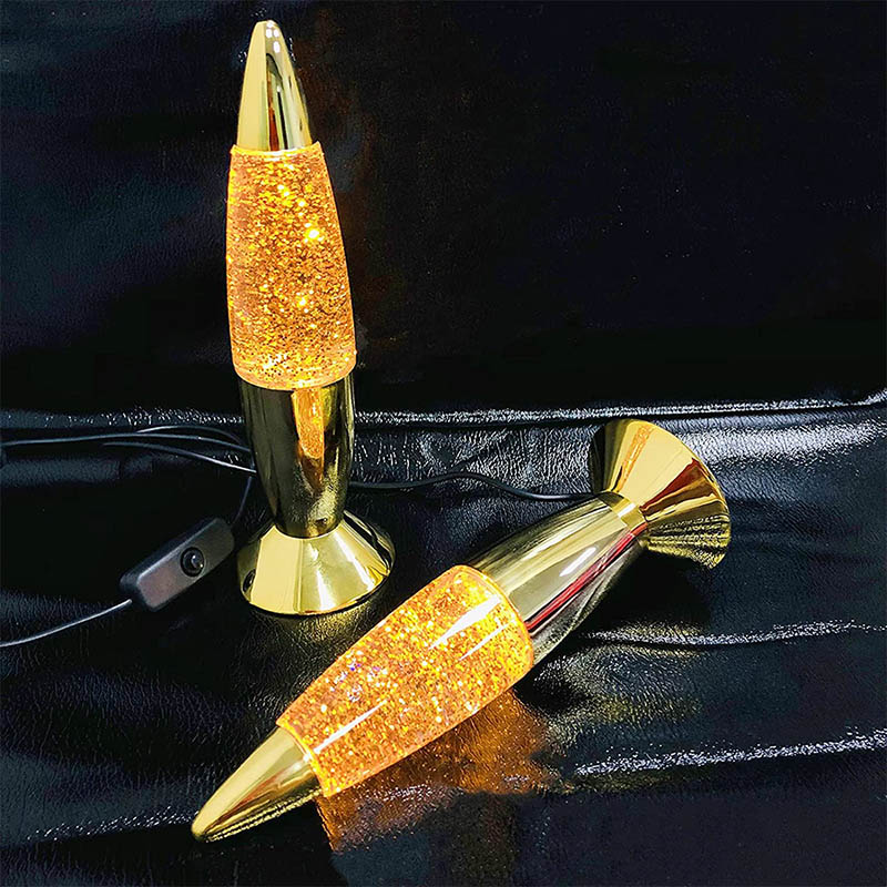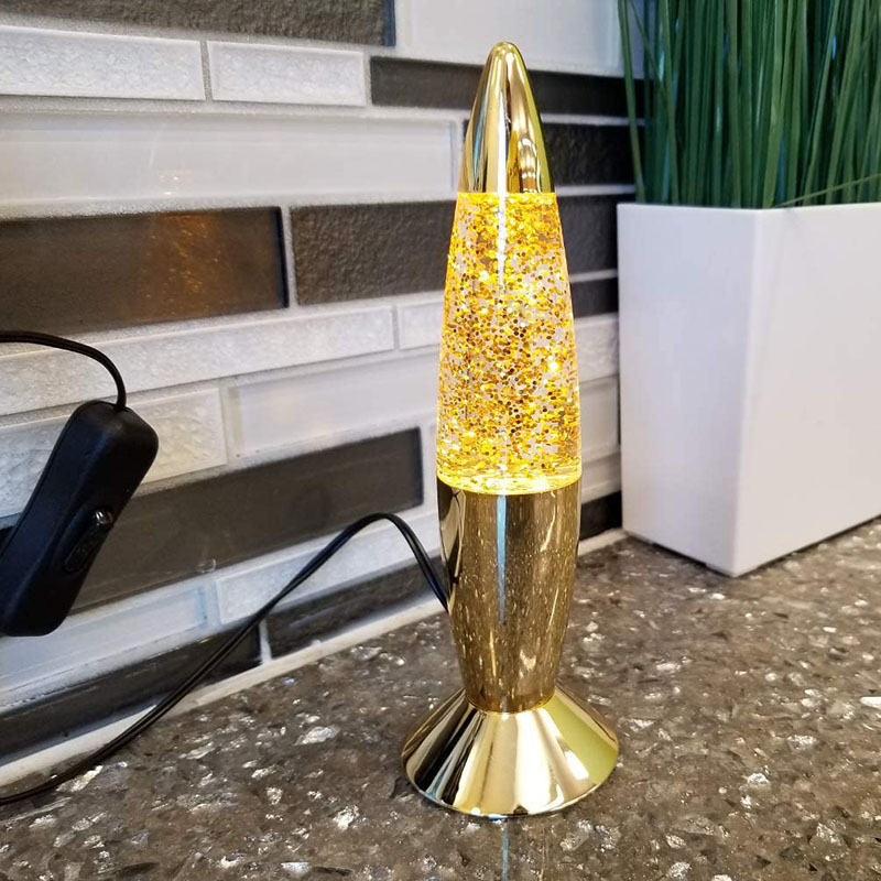 Tá leacht taobh istigh den bhuidéal ag an lampa glitter 7 orlach. Gluaiseann an leacht go neamhrialta tar éis é a théamh. tá orlach difriúil agus buidéal stíl dath difriúil.