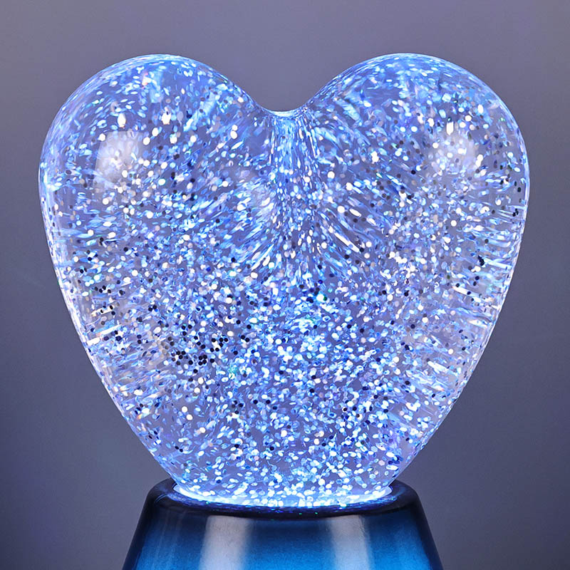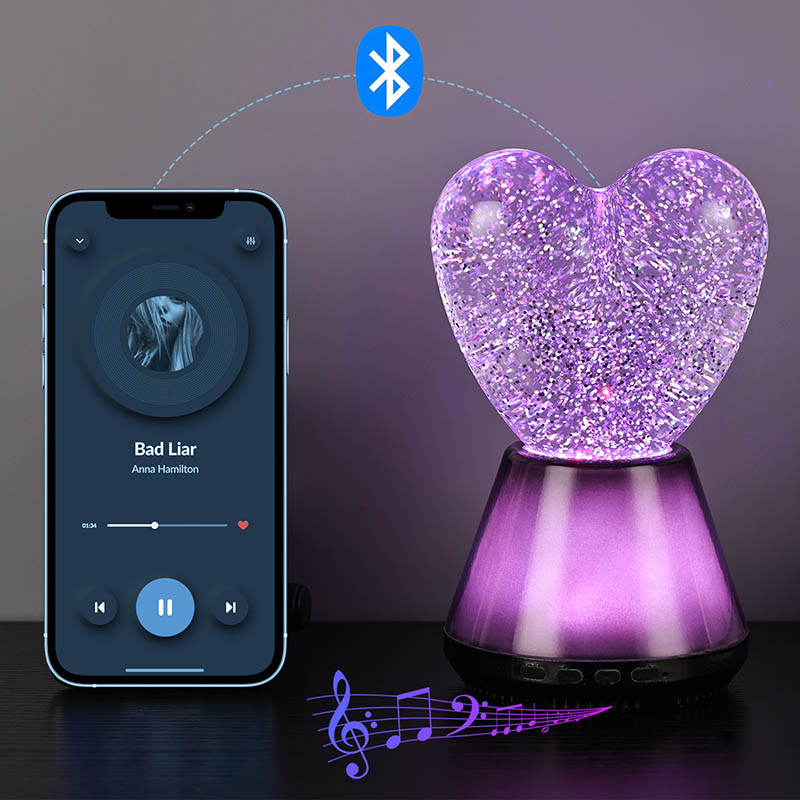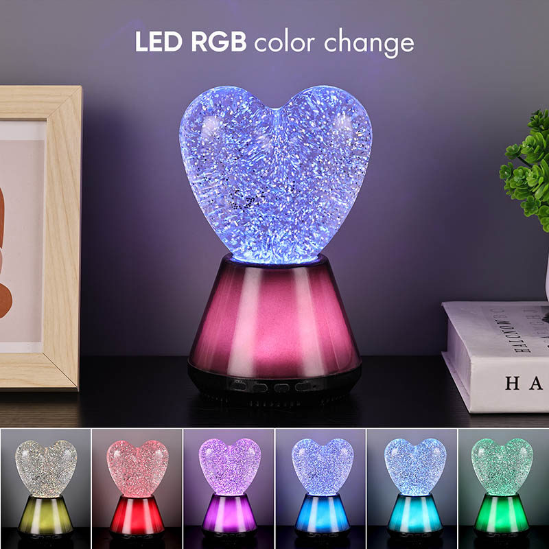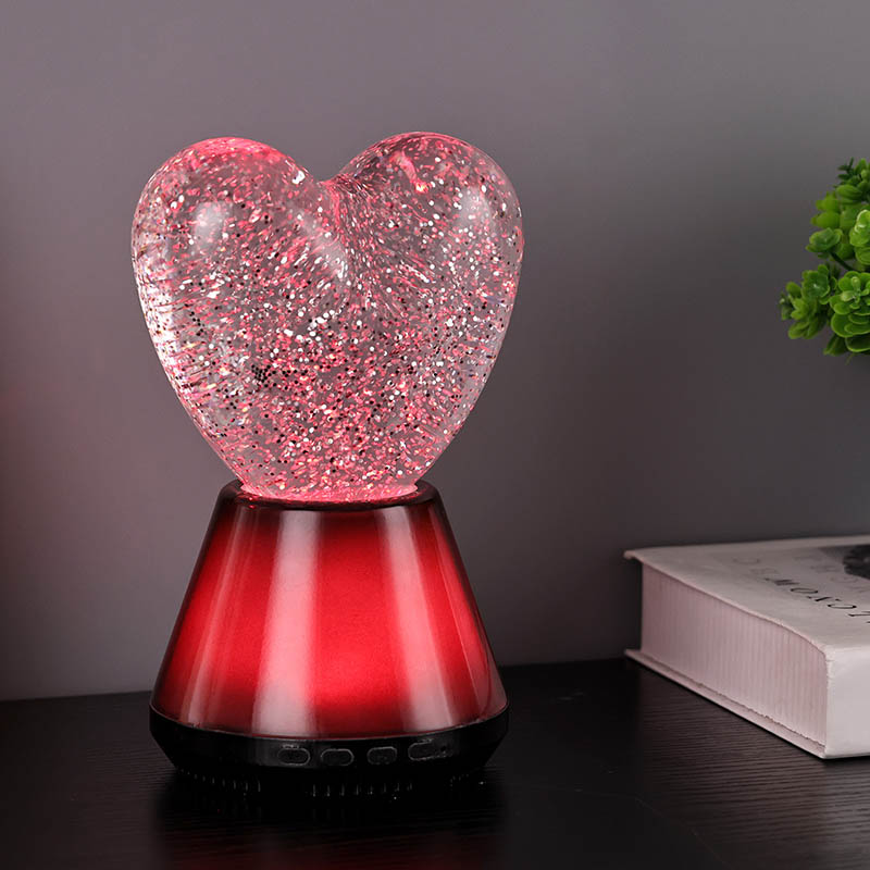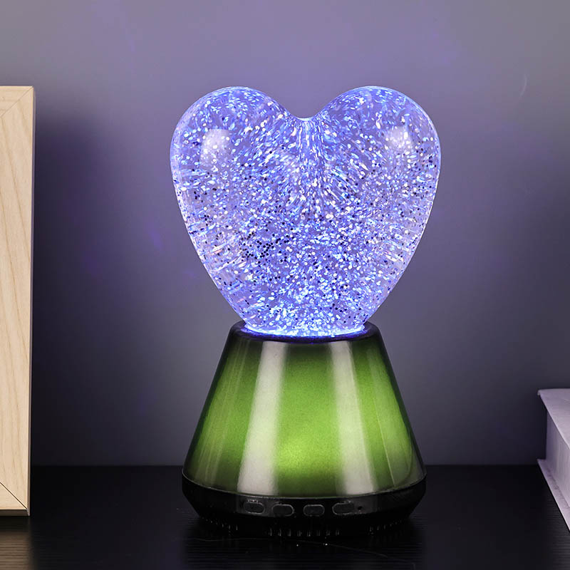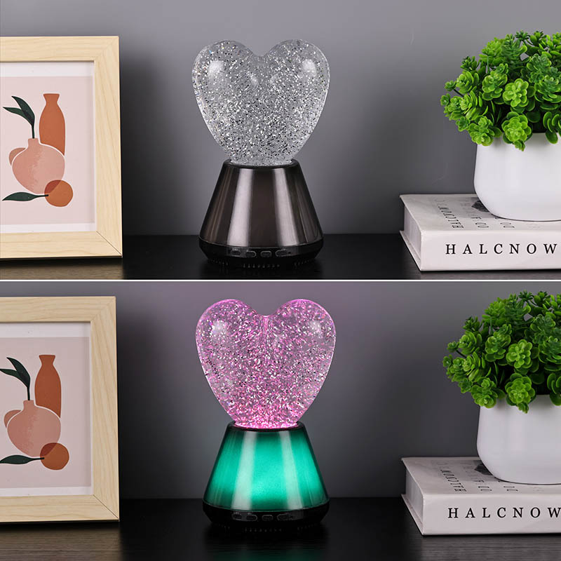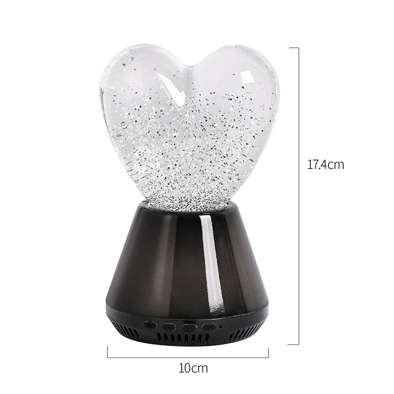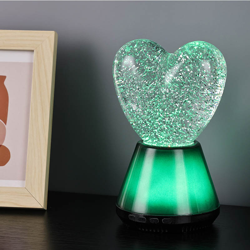 Tá an taobh istigh de sholas oíche croí glitter faoi stiúir Bluetooth líonta le leacht mistéireach, ina bhfuil líon na sequins súilíneacha ar snámh. Nuair a bhíonn an lampa ar siúl, beidh an leacht ag sreabhadh go mall taobh istigh den liathróid ghloine croí-chruthach, rud a chruthaíonn éifeacht aislingeach. Is cosúil go bhfuil na sequins seo cosúil le réaltaí scaipthe, ag snámh go réidh sa leacht, rud a thugann mothú do dhaoine go bhfuil siad sa spéir réaltach. Cibé an lá nó oíche é, le scáth croí féadfaidh sé iontas agus áthas a thabhairt do leanaí, rud a ligeann dóibh a samhlaíocht a scaoileadh sa soilsiú aislingeach.