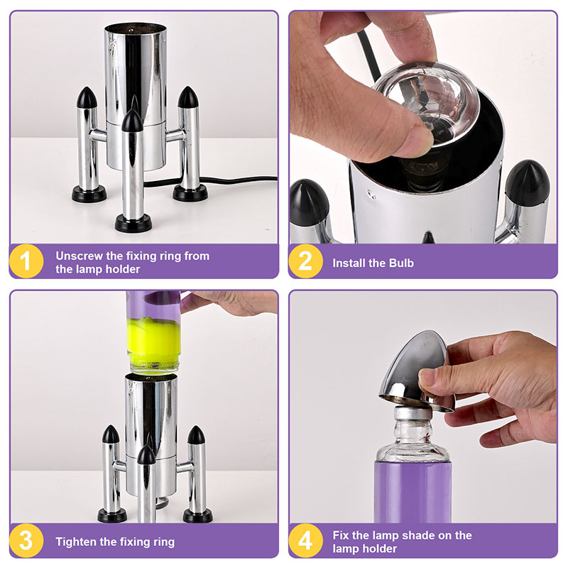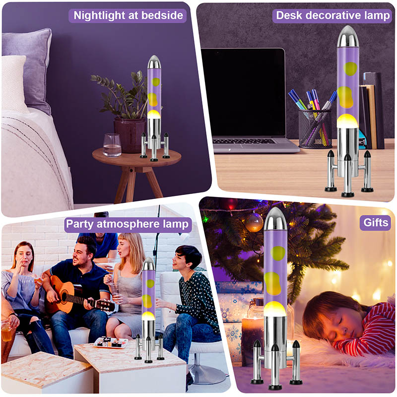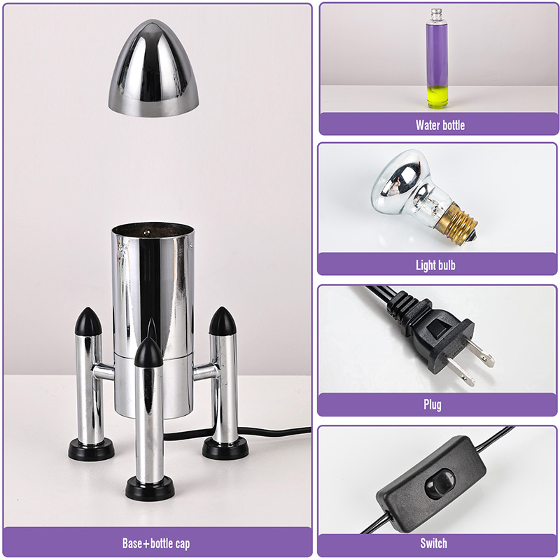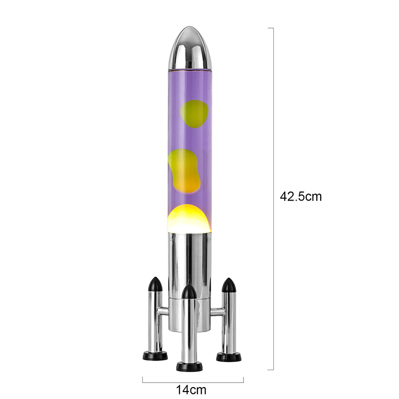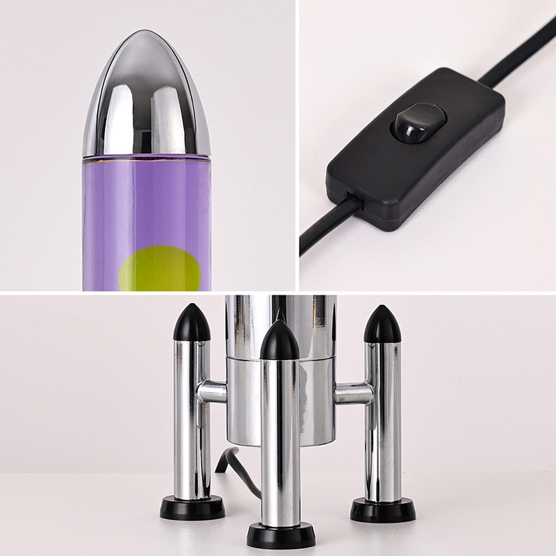 24VGnéithe lampa Lava LED mór le scáth roicéad dearadh clasaiceach múnlaithe roicéad, le blaosc miotail airgid péireáilte le comhlacht trédhearcach buidéal gloine, simplí fós stylish. Snámhann buí sa leacht corcra taobh istigh