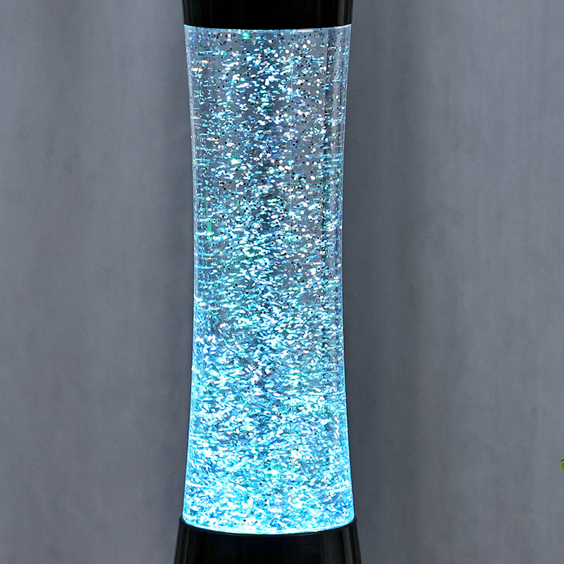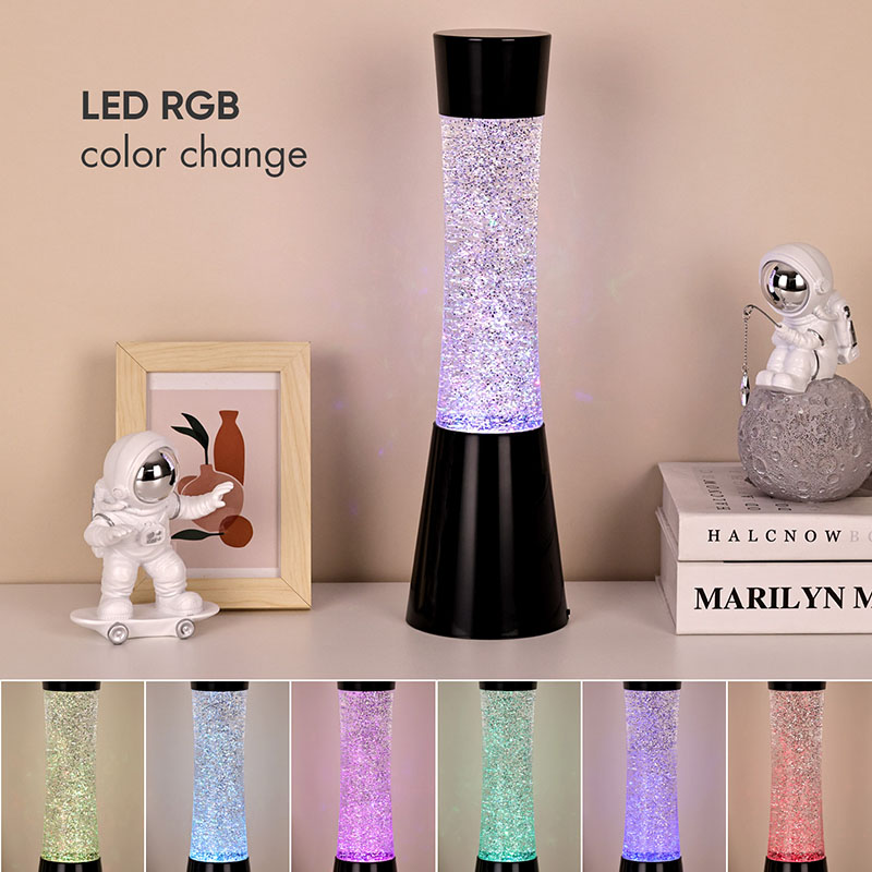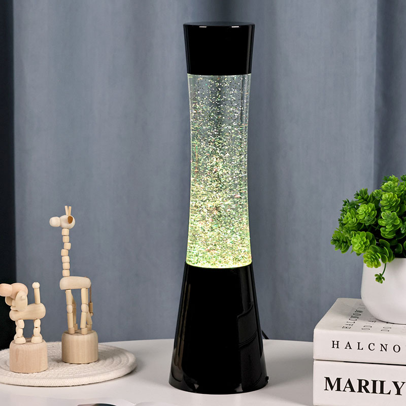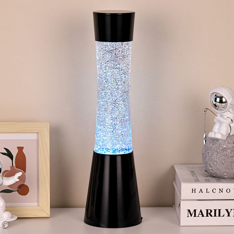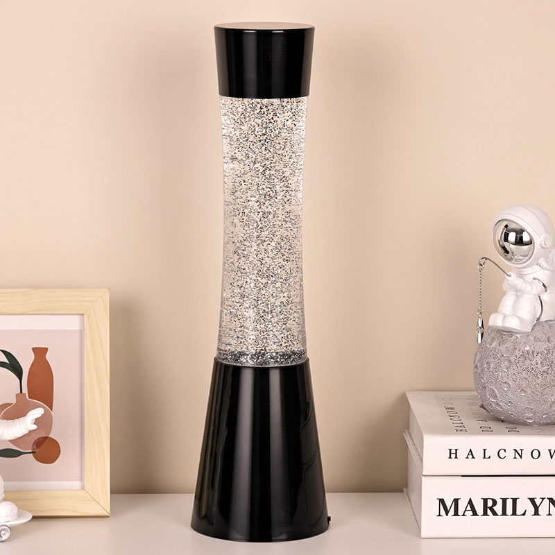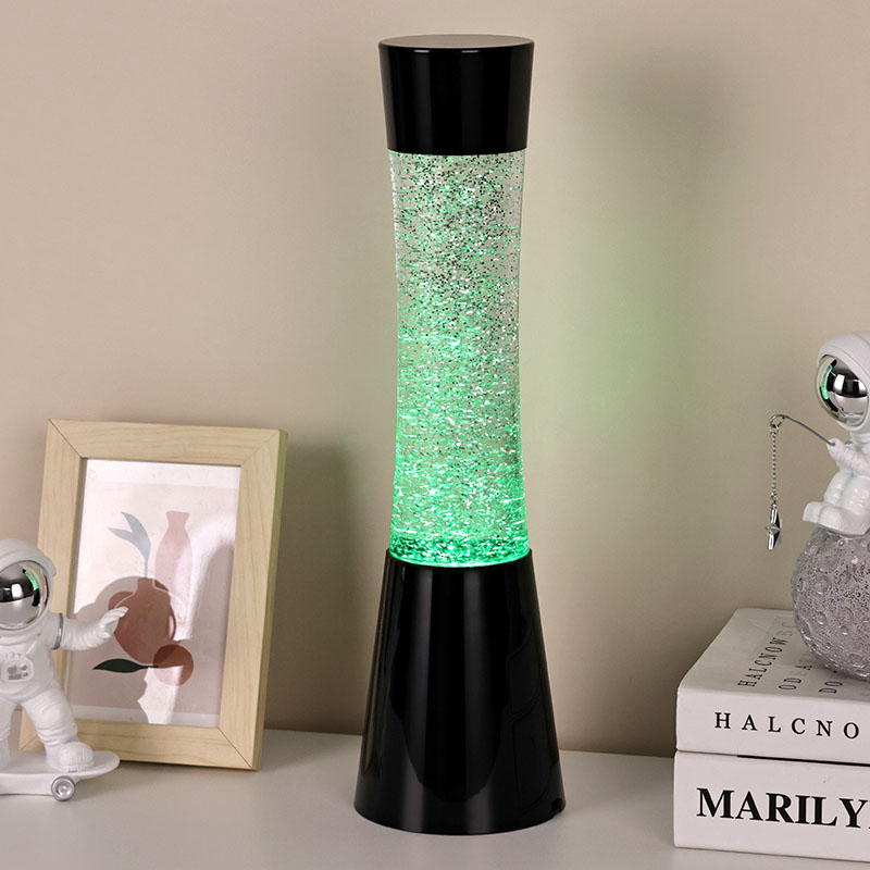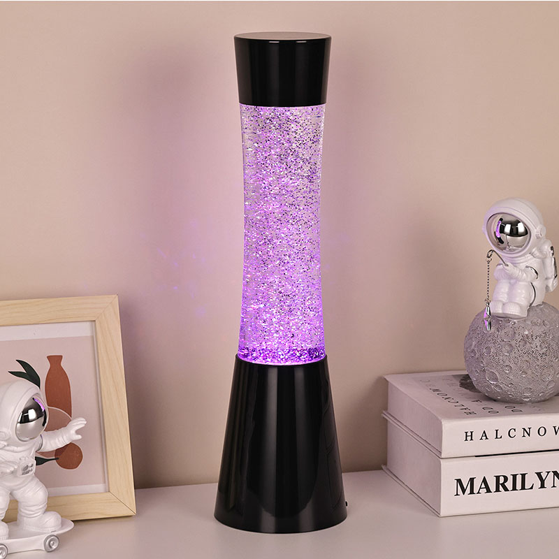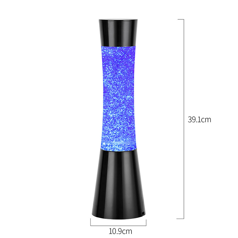 Tá lampa lava glitter faoi stiúir le ceallraí 3AAA déanta as ábhair phlaisteacha agus miotail ardchaighdeáin, le dea-chobhsaíocht agus marthanacht. Tá an comhlacht buidéal plaisteacha snasta agus cóireáilte go mín, agus mar thoradh air sin tá dromchla réidh agus íogair le luster bog. Tugann an bonn miotail uigeacht cobhsaí agus uasal don lampa, rud a fhágann go bhfuil sé níos cobhsaí agus níos iontaofa le linn úsáide.