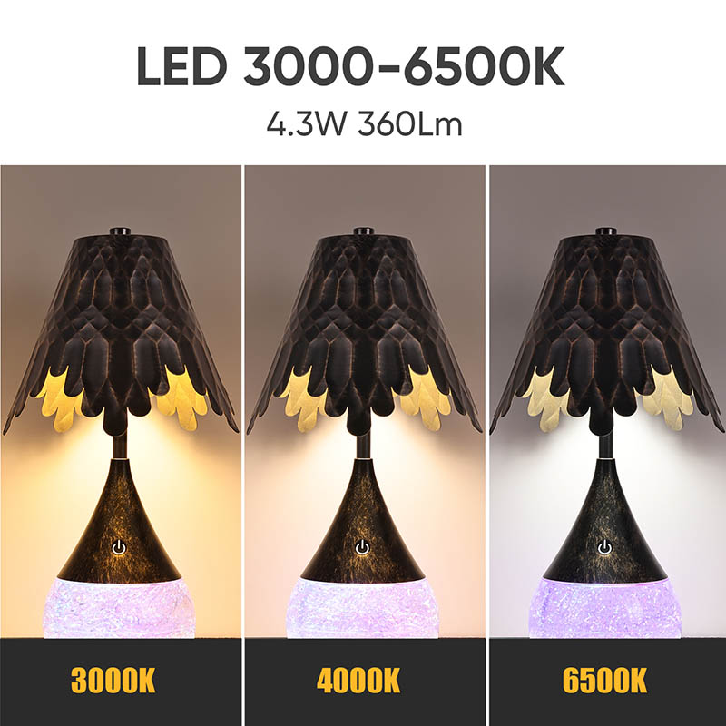 Tairgeann lampa deasc éadrom faoi stiúir le buidéal glitter RGB trí mhodh soilsithe príomhúla: solas fuar, solas te, agus solas nádúrtha. Is féidir gach modh a mhionchoigeartú trí shleamhnán laghdaitheach tadhaill atá suite ar bhonn an lampa nó trí app soghluaiste compánach (roghnach). Tá solas fuar oiriúnach do thascanna fócasaithe a éilíonn gile ard, amhail códú nó staidéar. Cruthaíonn solas te atmaisféar cluthar, ag tabhairt cuireadh dó, foirfe chun scíth a ligean nó léamh roimh am codlata. Déanann solas nádúrtha aithris ar sholas an lae, ag laghdú brú na súl agus ag cur foláirimh chun cinn le linn uaireanta an lae.