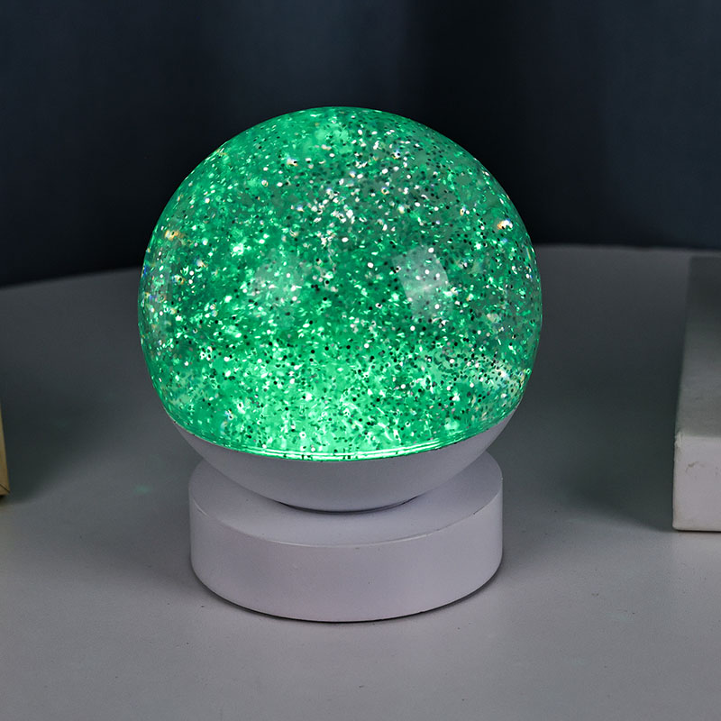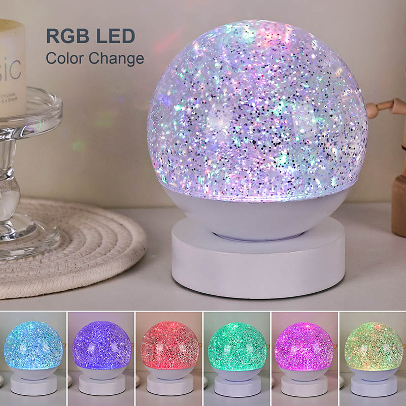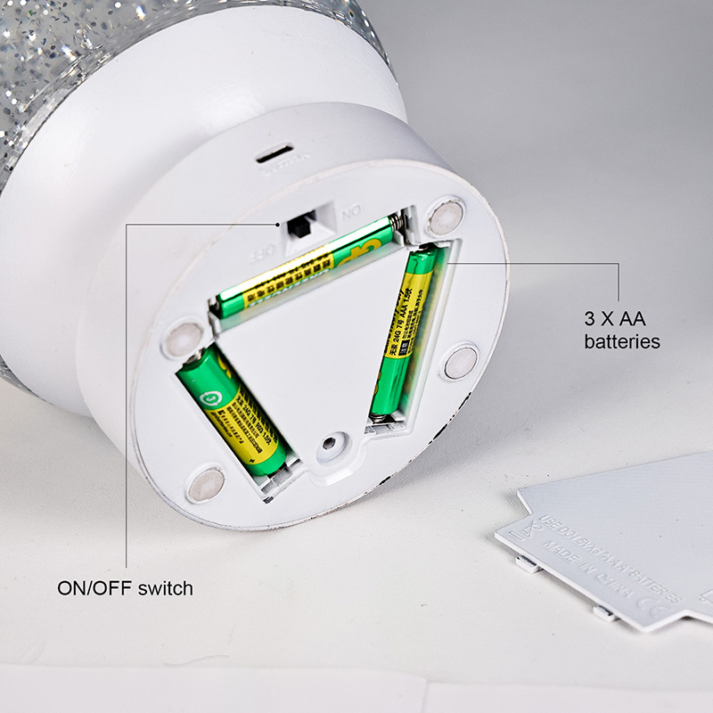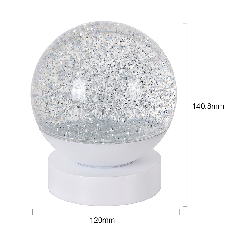 Tá Lampa Maisiúcháin Glitter RGB faoi stiúir déanta as ábhar aicrileach ardchaighdeáin, a bhfuil sféar tréshoilseach aige le tarchur solais den scoth. Tá an bonn déanta as plaisteach ABS atá neamhdhíobhálach don chomhshaol, rud a chinntíonn cobhsaíocht, marthanacht agus sábháilteacht gan substaintí tocsaineacha. Feidhmíonn sé ar thrí chadhnraí AAA tógtha (ceallraí a dhíoltar ar leithligh), rud a chuireann deireadh leis an ngá atá le asraon cumhachta agus ag tairiscint úsáid áisiúil. Foirfe le haghaidh socrúcháin ag an leaba, deasc, nó i gcúinne bréagán linbh. Le lasc tadhaill simplí, is féidir an solas a chasadh air nó as go héasca, rud a fhágann go bhfuil sé éasca le húsáid fiú do leanaí oibriú go neamhspleách.