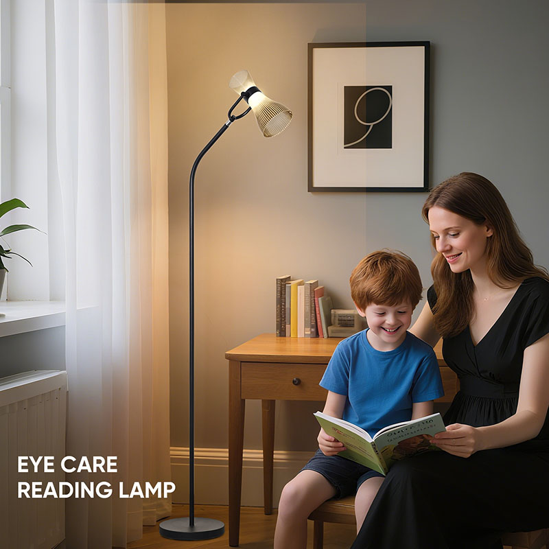 Tá lampa urláir faoi stiúir nua-aimseartha le scáth gloine feistithe le foinsí solais stiúir chun cinn a scaoileann solas bog agus geal, a chosnaíonn go héifeachtach do shúile agus a laghdaíonn tuirse agus míchompord de bharr úsáid súl fada.
