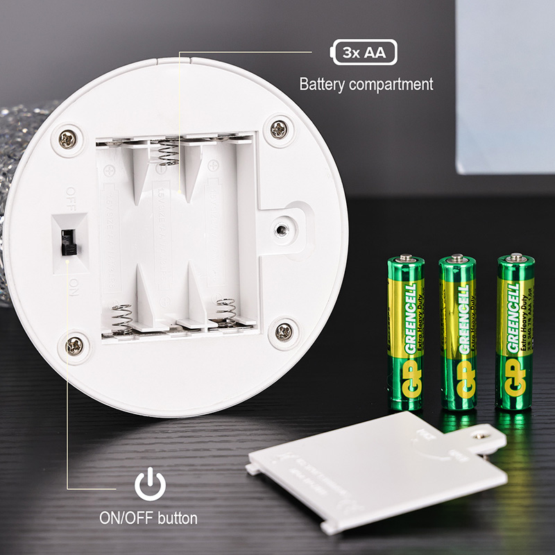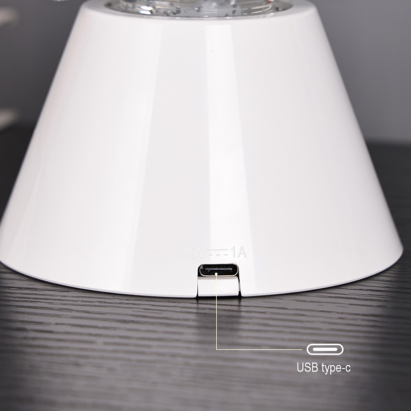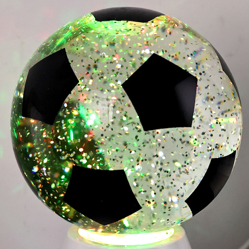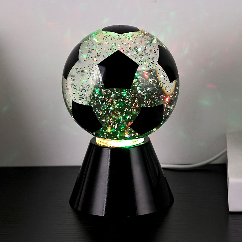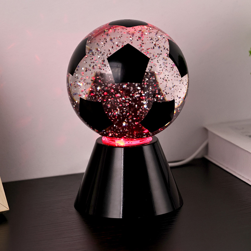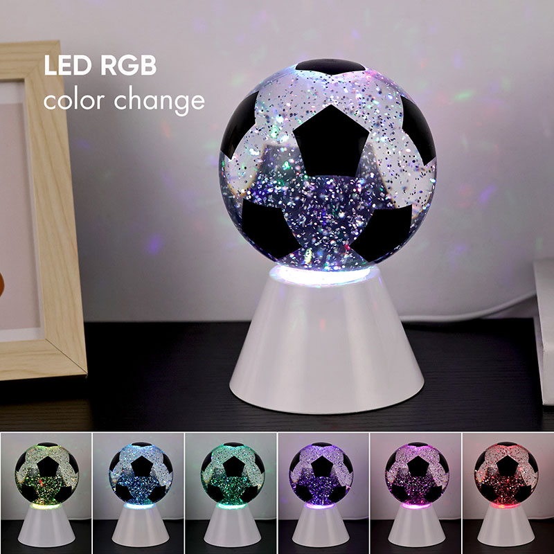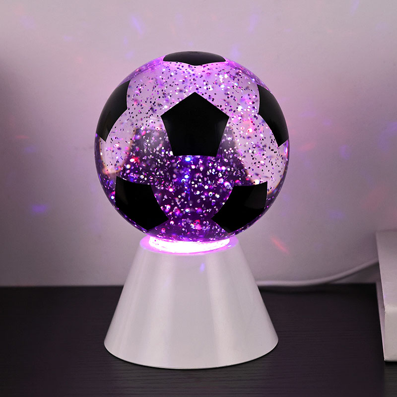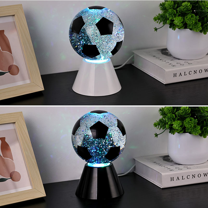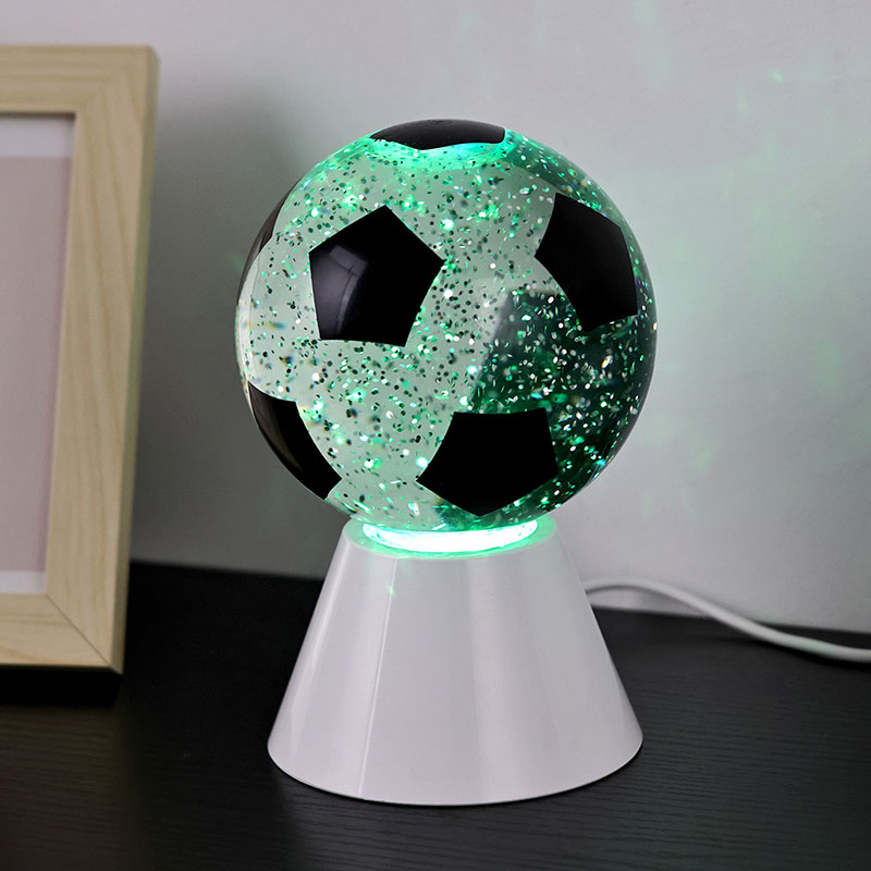 Bán + dath LED ag athrúTá an solas bronntanais sféarúil comhdhéanta de ghloine uachtarach agus bonn plaisteach. Tá an dromchla gloine clóite le patrúin peile, is féidir a phriontáil i dathanna éagsúla. Is í an phríomhghné de Night Light le Peile Shade ná go bhfuil leacht taobh istigh den sféar, ina bhfuil sequins. Tar éis an lasc a iompú, tosaíonn an mótar beag ionsuite ag obair, agus bogfaidh an leacht taobh istigh den ghloine go neamhrialta. Ag an am céanna, tosaíonn solas bun Night Light le Football Shade ag athrú, rud atá an-álainn. Úsáidtear Solas Oíche le Scáthú Peile go príomha le haghaidh maisiú taobh istigh, i seomraí, seomraí suí, seomraí óstáin, agus áiteanna eile, Tagann an táirge le muirearú USB freisin agus is féidir cadhnraí 3AAA a úsáid.