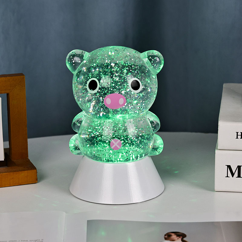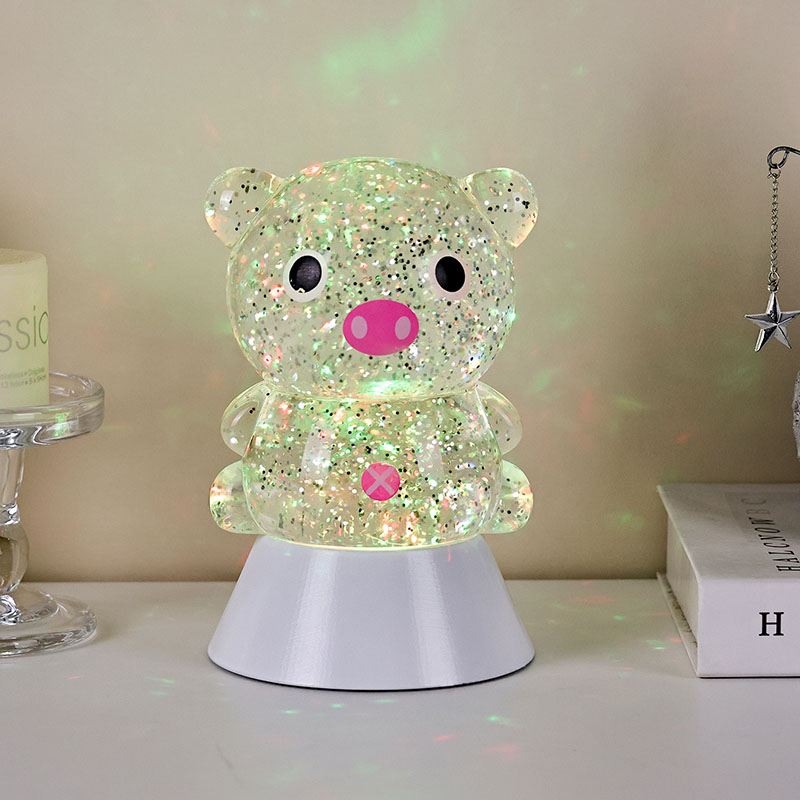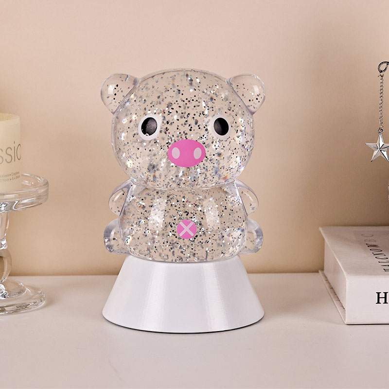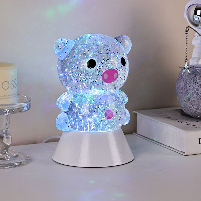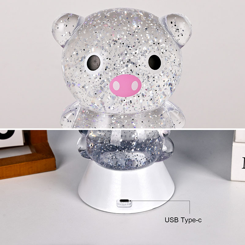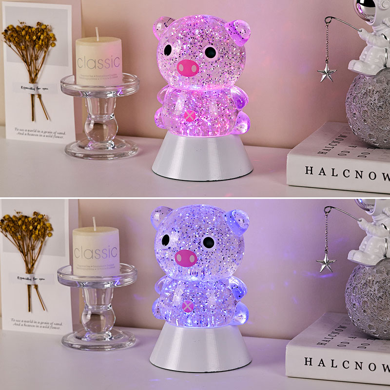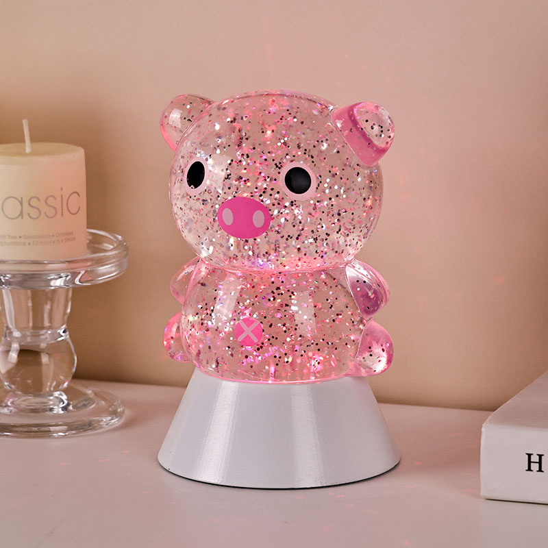 Gnéithe an dearadh foriomlán íomhá gleoite agus adorable muc, lena comhrianta cruinn agus plump péireáilte leis na súile móra, smuit bándearg, agus cluasa beaga adorable, a ghabháil láithreach an gcroí na ndaoine fásta agus leanaí. Tá an bhlaosc roisín trédhearcach líonta le sequins daite súilíneacha agus leacht speisialta, a shreabhann go réidh leis an leacht nuair a bhíonn na soilse ar siúl, rud a chruthaíonn éifeacht amhairc aislingeach cosúil le abhainn réaltach ag sreabhadh laistigh den chorp muc. Rothlaíonn na dathanna solais tríd go huathoibríoch, ag aistriú ó bhándearg bhog agus corcra aislingeach go gorm agus glas úr, ag athrú go leanúnach isteach i tuar ceatha dathanna a chruthaíonn atmaisféar síochánta ach draíochtúil, amhail is dá mba rud é go dtabharfaidh saol na scéal fairy i ndáiríre.