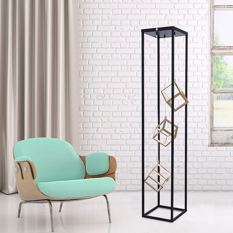 Lampaí urláir deartha nua-aimseartha, is é an ghné is mó den táirge an cruth fráma dronuilleogach comhdhéanta de mhiotal, le 3 chandeliers LED cearnach taobh istigh. Is féidir an dearadh foriomlán a úsáid mar mhaisiú sa halla, agus tá cnaipe ag an mbarr chun déine an tsolais a rialú