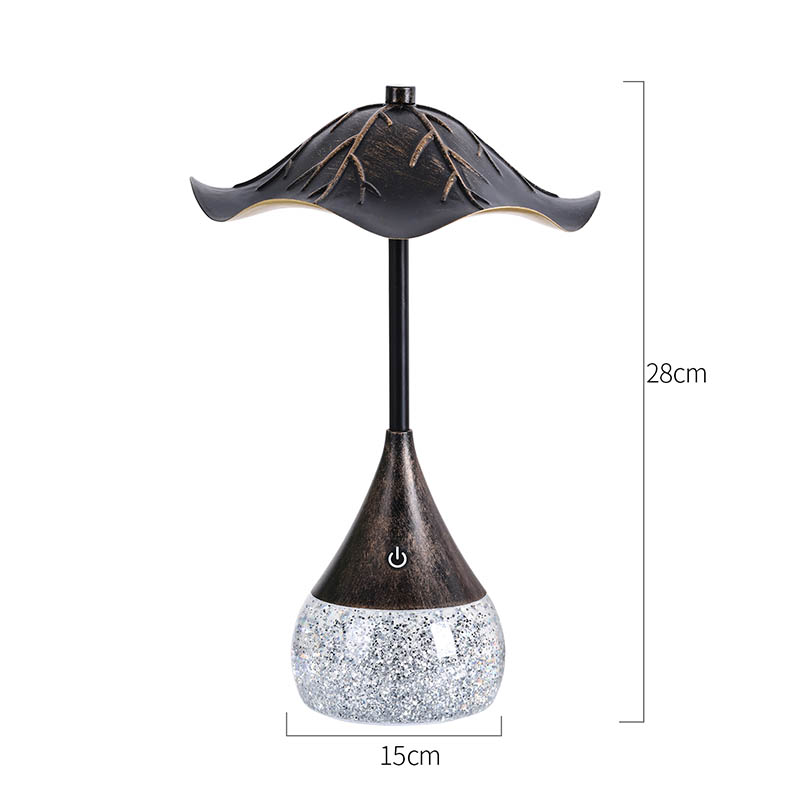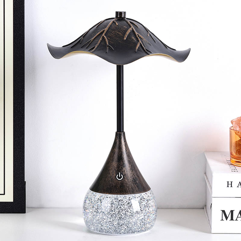 Is é croílár an lampa seo a bharr buailte cosúil le scáth fearthainne, atá i gcuimhne ar chaipín muisiriún íogair atá maisithe le patrúin duille órga chasta. Ní hamháin go gcuireann an dearadh seo teagmháil le háilleacht a spreagann an dúlra le do thimpeallacht ach feidhmíonn sé freisin mar chlúdach idirleata feidhmiúil don fhoinse solais, ag cruthú bog, fiú amháin atá taitneamhach do na súile.