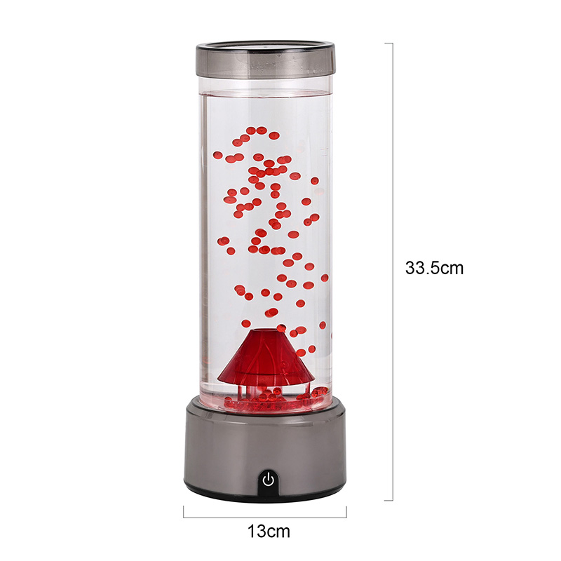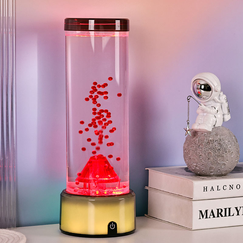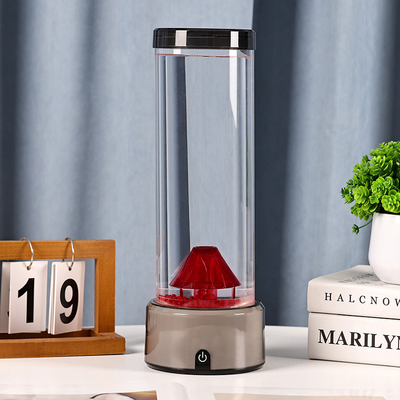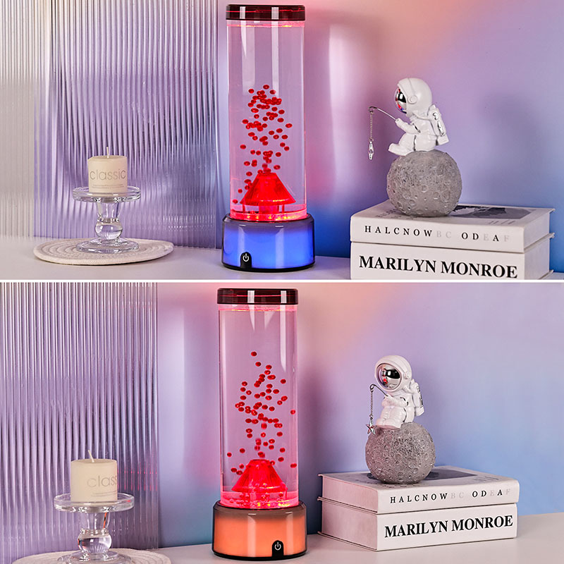 I gcroílár an lampa tá mionsamhail bolcán, atá deartha go dlúth le bheith cosúil le fíorchón bolcánaithe. Nuair a chumhachtaítear é, tosaíonn an bolcán ag “brúchadh,” ag seoladh cáithníní de dhath dearg aníos tríd an gcolún leachta i ngluaisne leanúnach rithimeach. Ardaíonn agus titeann na cáithníní seo, atá ar crochadh i leacht neamhthocsaineach atá foirmlithe go speisialta, cosúil le boilgeoga laibhe, rud a chruthaíonn éifeacht hypnotic a mheabhraíonn bolcán gníomhach. Tá an ghluaiseacht á thiomáint ag córas caidéil inmheánach beag, a scaipeann an leacht go réidh ach go comhsheasmhach, ag cinntiú feidhmíocht fhadtéarmach gan róthéamh.