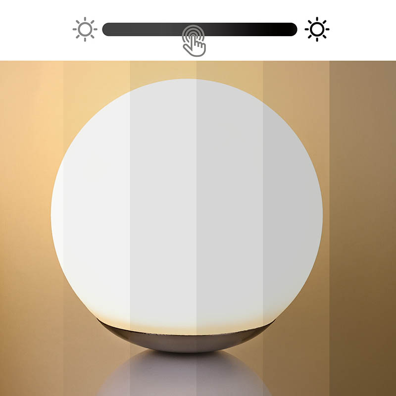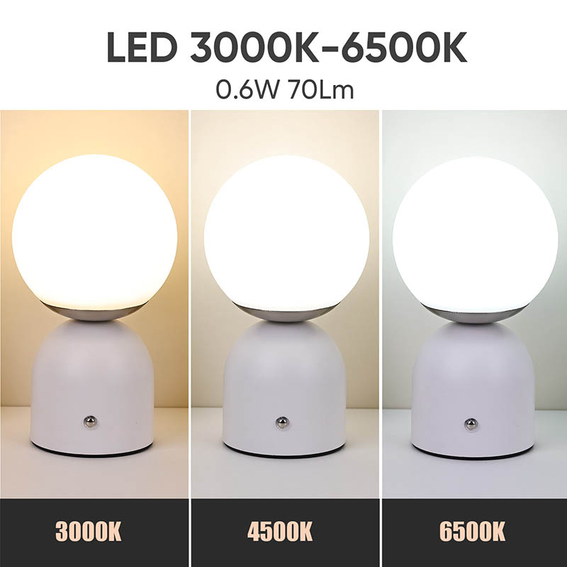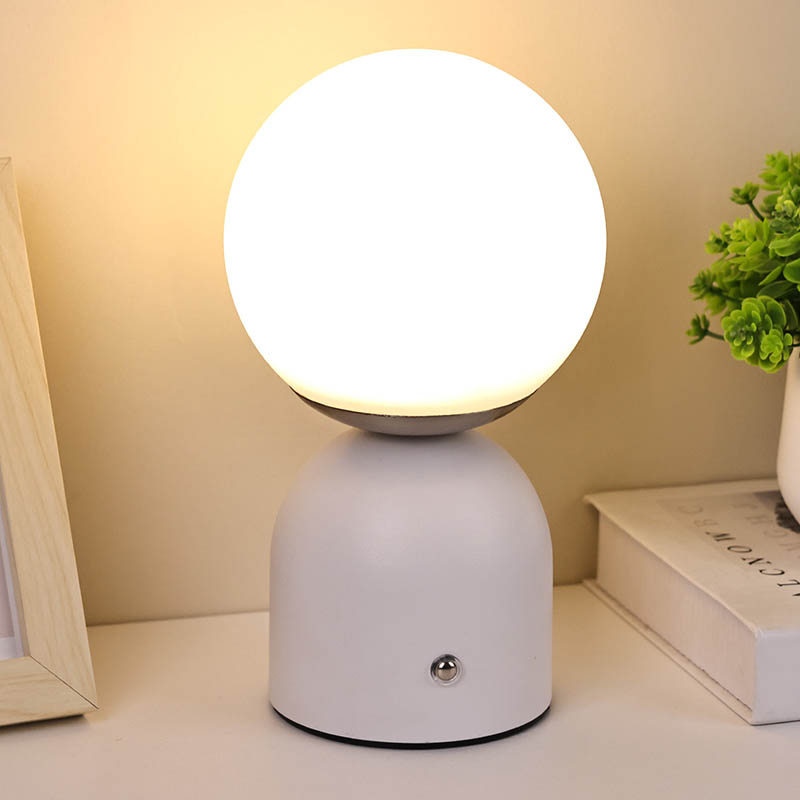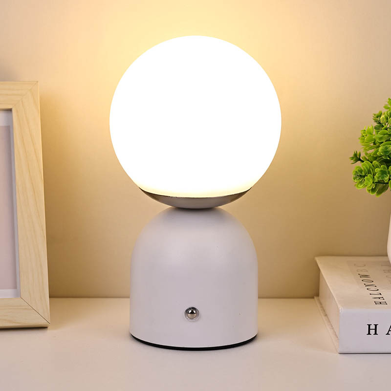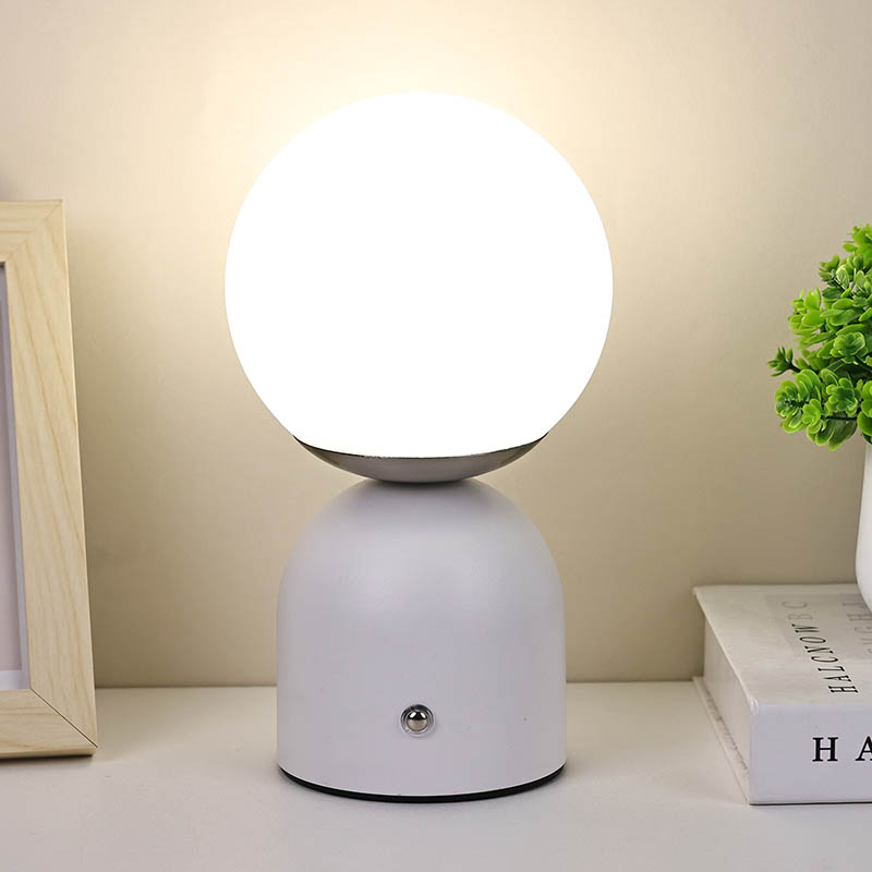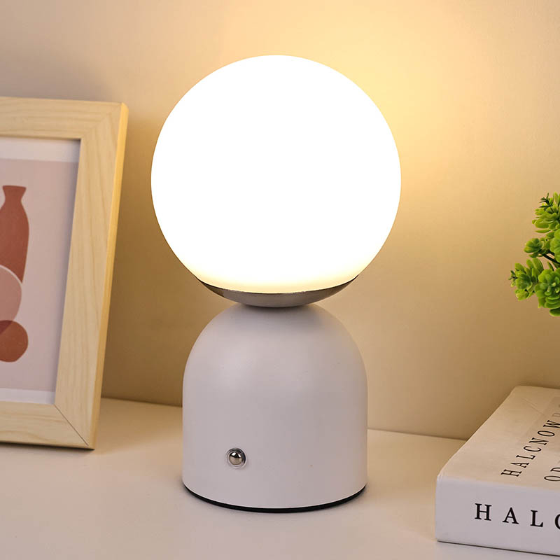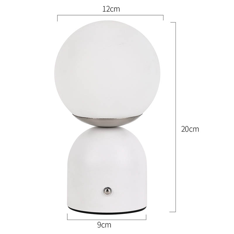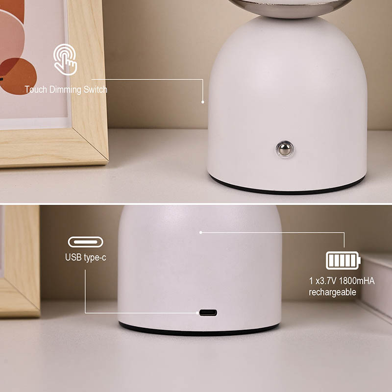 Dubh, bánLampa Tábla Beaga Le ceallraí Tá dearadh simplí ag Rechargable, tá sé soghluaiste, agus is féidir é a úsáid le haghaidh maisiúcháin. Tá an ceann comhdhéanta de chlúdach Corpoideachais, agus shineann an solas tríd an gclúdach. Tá an solas dath te an-bhog. An dearadh sféarúil ar fad, is é an bun freisin dearadh miotail leath slán le cruth leathsféar stua-chruthach, leabaithe le lasc tadhaill a choigeartú an light.Small Tábla Lampa Le ceallraí Tá Rechargable faoi thiomáint ag ceallraí, is féidir a mhuirearú le cábla USB cineál C.