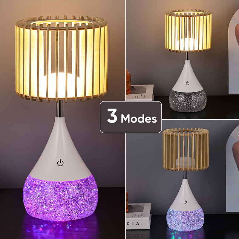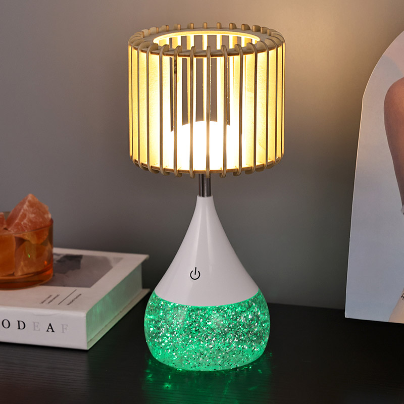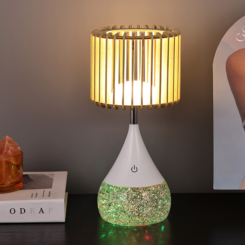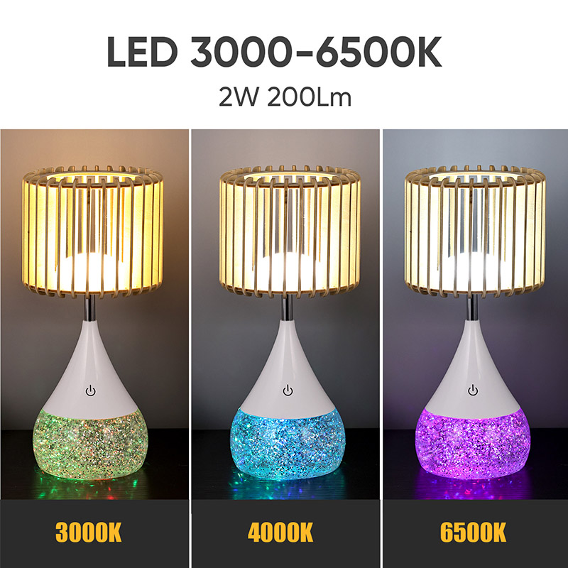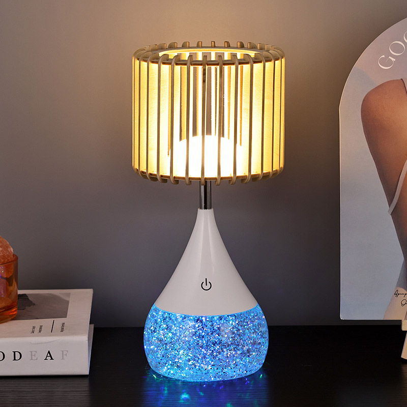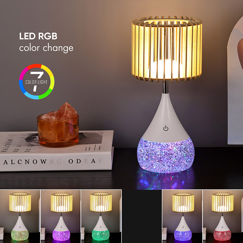 Dearadh:** Scáth lampa adhmaid uathúil, bonn a athraíonn dath RGB